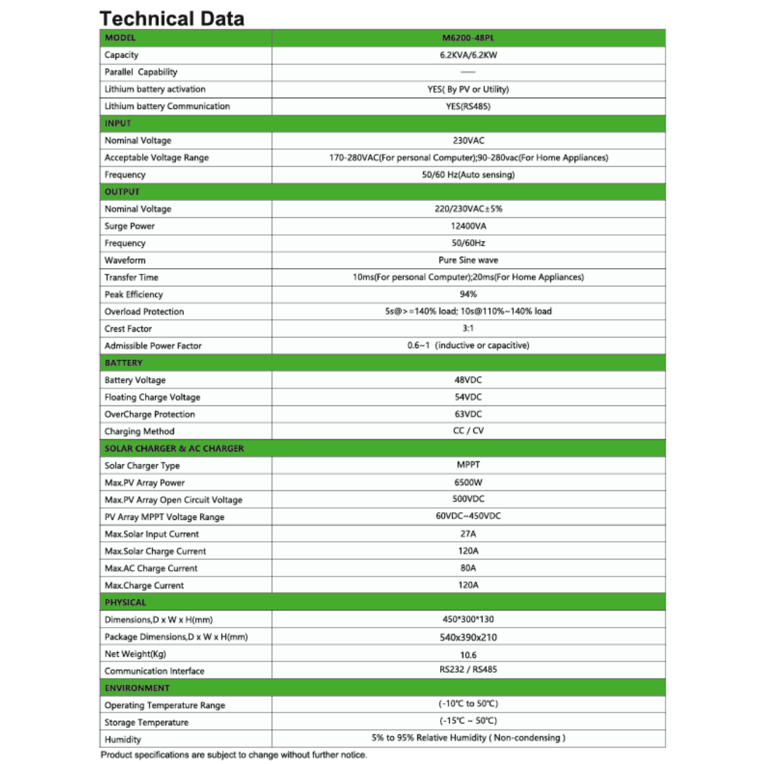 🔋 Tek ünitede yüksek güç: 6.2 kW tam sinüs güç ile ev ve işletmeler için ideal offgrid çözüm.