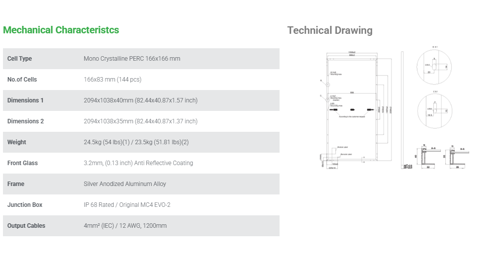🔧 Kurulum Kolaylığı: 4 mm² çıkış kabloları, IP68 bağlantı kutusu ve MC4 EVO-2 konektör uyumu.