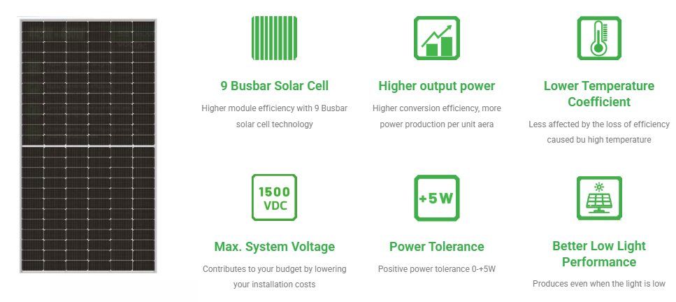 🔋 Yüksek Verimlilik (%21.12): Daha fazla enerji üretimi için 9 Busbar monokristal PERC hücre teknolojisi.
