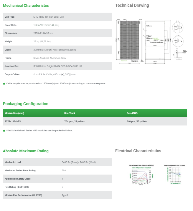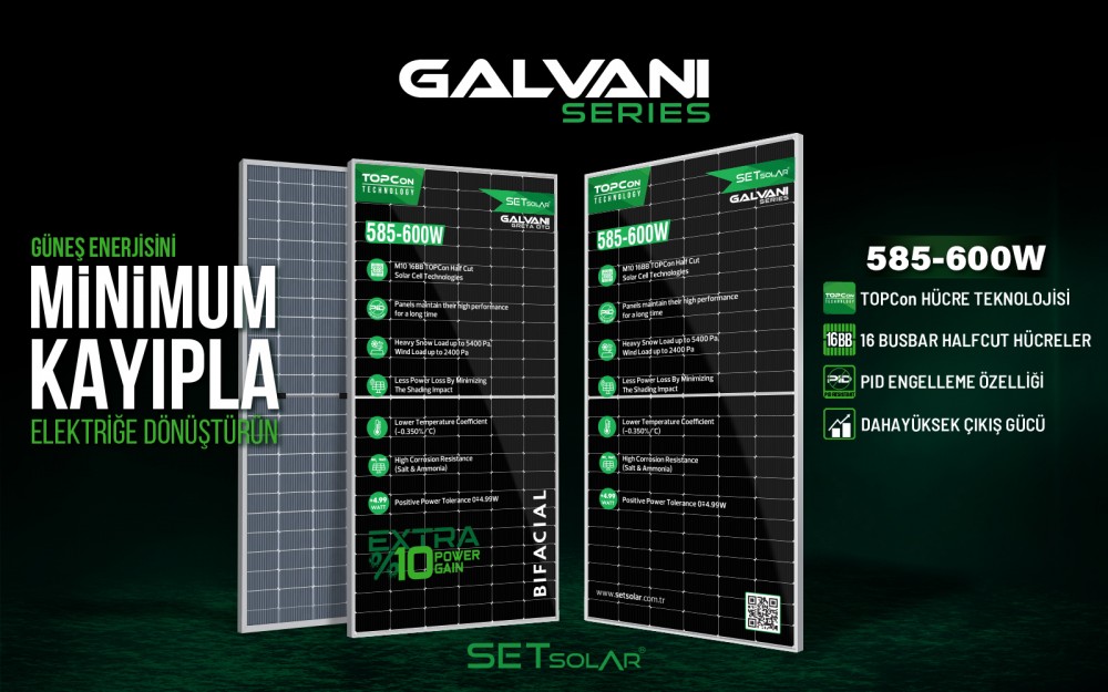 SET Solar’ın GALVANİ Serisi, TOPCon hücre yapısı ve 16 Busbar Half-Cut mimarisi sayesinde yüksek verimlilik, düşük sıcaklık kaybı ve daha uzun kullanım ömrü sunar. PID dirençli yapısı, güçlü mekanik dayanımı ve düşük ışık performansıyla hem büyük ölçekli GES projeleri hem de ticari çatı uygulamaları için en verimli çözümlerden biridir.